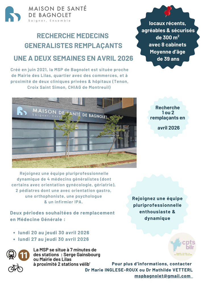 Remplacement recherché du 20 au 30 avril 2026 à la MSP de Bagnolet. Equipe dynamique de professionnels de santé. Locaux récents et sécurisés.