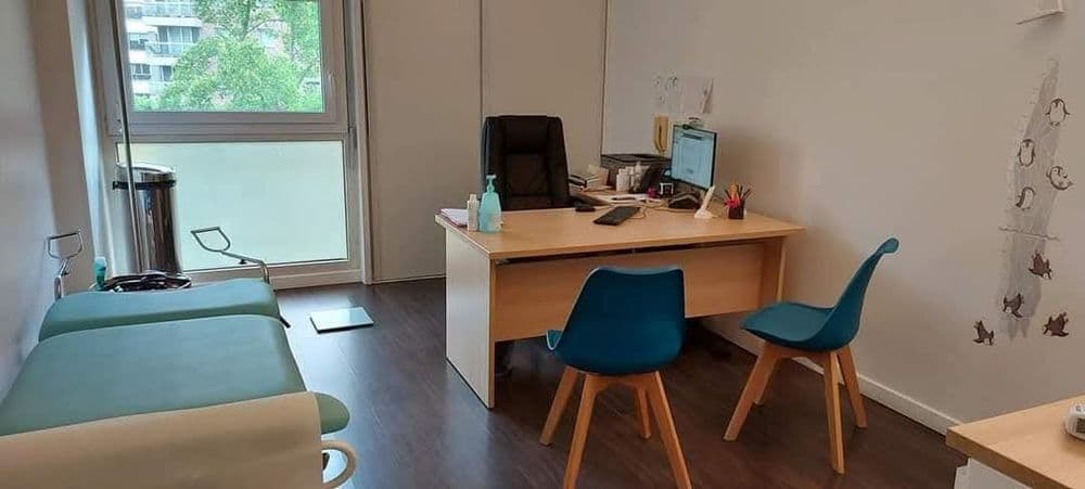 Cabinet de groupe (2 médecins généralistes, une podologue, une orthophoniste, une ostéopathe, une ophtalmologue). Très bonne ambiance avec les autres professionnels. Salle pour prendre le repas avec machine à café, four et micro onde.